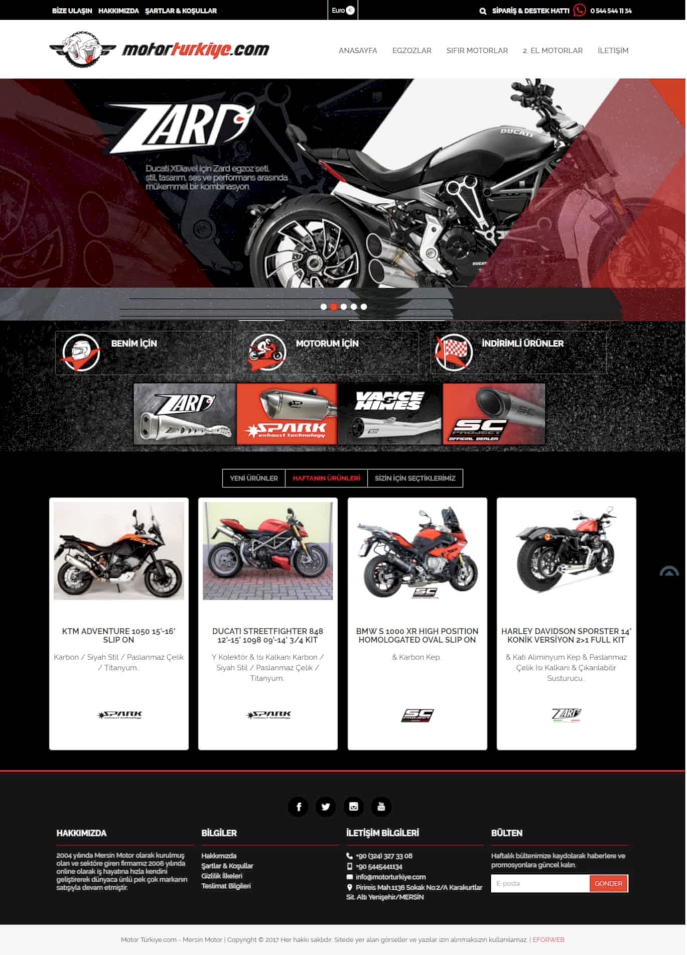 Mersin-Yenişehir lokasyonlu mağazasında Kawasaki motosiklet, Kawasaki Marine markaların satış, satış sonrası yedek parça ve yetkili servis hizmetlerini veren Motor Türkiye E-Ticaret sitesinin geliştirilmesinde tercihini Eforweb olarak kullanmıştır.